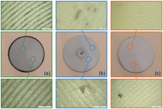 Additionally, certain defects associated with these specimens are observed, which are related to material deposition defects that evolve as more coating thickness is added. In Figure 2a, it can be seen that with the lowest thickness, gaps between the filaments caused by irregular flow appear, as well as marks consistent with the appearance of porosities. As the thickness increases (Figure 2b), these gaps are covered and are no longer visible, but in some areas, dark colouration still appears, indicating a thinner coating thickness as the substrate is partially visible. Additionally, flow defects continue to appear but in a much more discontinuous manner. These defects continue to appear in the greater thickness (Figure 2c), although the rest of the defects are no longer visible due to the thickness of the layer. Therefore, it can be determined that increasing the thickness stabilises the surface of the specimen.