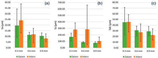 These defects will impact the surface quality and texture of the parts. If Sa is analysed (Figure 3a), understood as the average height deviations of the surface from a mean line within the measurement area, it is observed that as the coating thickness increases, there is a trend towards decreasing roughness. In fact, it is observed that when the coating is thinner, the deviations are very large, indicating that the average surface is very rough. However, there seems to be no significant difference between an internal and external area, which may mean that the surface is homogeneous.