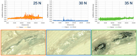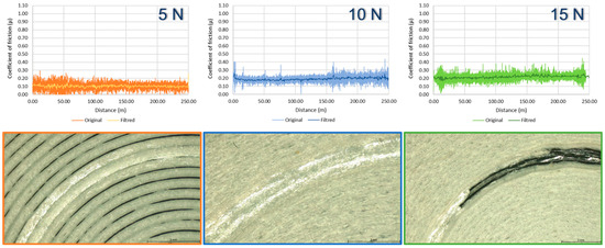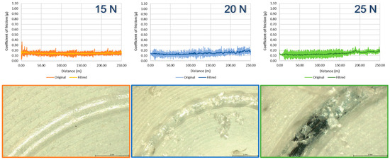 Analysing the tests conducted on specimens coated with a tribomaterial layer (0.3 mm), it is observed that as the load increases, the average coefficient of friction seems to increase (Figure 4). However, there is a much greater difference between 5 and 10 N than beyond. Similarly, it is observed that at the maximum load, this coating layer is worn away, implying that the part could not continue to function properly. On the other hand, in all three cases, the behaviour is very stable, with no significant jumps in the amplitude of the curve.
