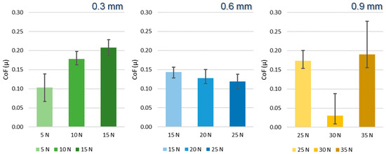 On the other hand, increasing the coating shows more-stable behaviour, even manifesting a slight trend of decreasing the coefficient of friction, which is very unusual when compared to previous observations [46]. However, comparing it with the previously analysed graphs, the difference is insignificant compared to the amplitude of the tests (Figure 4), which are also quite stable.