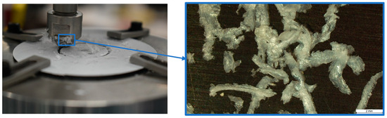 This is noticeable in Figure 5, where the formation of burrs generating these particles is observed, except in the intermediate case of 30 N, which offers the best result. Therefore, the formation of particles caused by filament breakage and burr formation seems to have an opposite and negative behaviour. Additionally, these particles (Figure 8) have a morphology different from those observed in other FFF materials [10,11]. In this case, they form elongated and almost-curled particles, more similar to chips, which may indicate greater plastic deformation of the material.