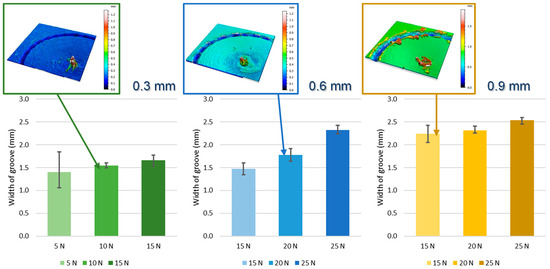 Increasing the coating and material load shows a similar but less-pronounced behaviour (Figure 5). The lower load in the case of 15 N seems to show the best coefficient of friction, increasing with the load until the coating breaks, which, in this case, is 0.6 mm. At 20 N, there are jumps in the width and depth of the groove that can be related to the stick and slip phenomenon. This phenomenon occurs when two surfaces in contact alternate between sticking phases (where they adhere and do not move) and sliding phases (where they slide over each other) and is closely related to the variation in the coefficient of friction under different loads, especially on FFF-fabricated surfaces [46]. On FFF-fabricated surfaces, variability in layer structure and surface roughness can make the stick and slip behaviour more pronounced. The applied load directly influences the transition between sticking and sliding phases, affecting the stability and smoothness of relative movement between the surfaces [48]. It can be observed that in the specimen tested at 25 N, from around 150 m, the curve behaviour changes, probably caused by slipping and coating loss.
