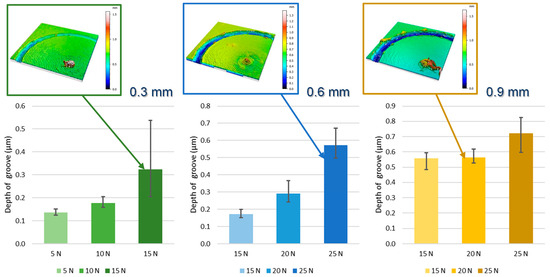 Analysing the generated groove, more linear behaviours appear. Analysing the groove width (Figure 9), it is observed that increasing the load increases the width in all cases, and at equal load, increasing the coating thickness results in less material loss. This aligns with the previously hypothesised trends. Regarding groove depth (Figure 10), the behaviour is similar, indicating that the wear behaviour of the parts is very homogeneous and stable. In this case, the statistical analysis (Table 5) reveals that coating thickness has little significance with respect to the groove width (F = 0.147; p-value = 0.7145) and groove depth (F = 0.488; p-value = 0.5110). In both cases, the F-value is very low, and the p-value is much greater than 0.05, indicating that variability in groove width and depth is not significantly influenced by coating thickness under the conditions of this study. This does not occur with load, which has significance with respect to groove width (F = 13.704; p-value = 0.0101) and groove depth (F = 15.495; p-value = 0.0077). In this case, the F-value is high, and the p-value is less than 0.05, indicating that he applied load has a statistically significant effect on groove depth and width. Although there is no significance in the interaction of both factors. These results indicate that the applied load has a significant influence on both groove width and depth, while coating thickness does not show a significant influence on these metrics.