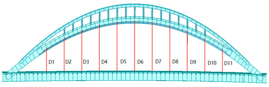 The MIDAS CIVIL 2022 software was utilized for bridge modeling and calculation; the main beam was simulated by using double main beams and transverse through the diaphragm; the hanger used cable elements, which are only tensile elements, the main beam, diaphragm, main arch and auxiliary arch use beam elements, the sidewalks on both sides of the bridge use plate elements, and the general support simulation supports. The whole bridge has 835 nodes and 950 elements. The bridge model is shown in Figure 3. The side diagram of the bridge and the number of the hanger are shown in Figure 4.