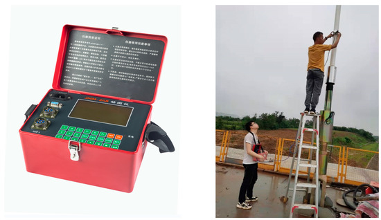 To ensure accuracy, multiple measurements were conducted on the 11 pairs of hangers on the bridge. Several datasets were collected and averaged to obtain the precise cable strength values for the bridge hangers. Figure 5 illustrates the installation of the JMM-268 dynamic measuring instrument (Kingmach Measurement & Monitoring Technology Co., Ltd., Changsha, China) by site construction personnel for cable force measurements.