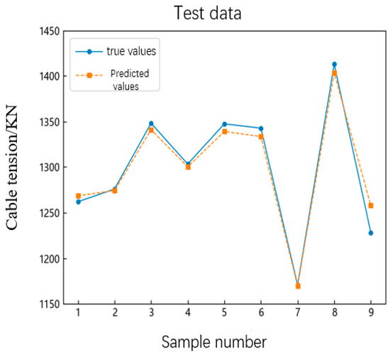 Following the flowchart for cable force prediction, as depicted in Figure 2, the QPSO-RBF-SVM algorithm model was trained 100 times, resulting in a stable and significantly low mean square error between the output value and measured value. The test set data were thoroughly analyzed and processed, with detailed findings presented in Table 2.