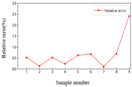 In order to better illustrate the predictive performance of the model, Figure 7 displays the relative error diagrams comparing the predicted and measured values of the hanger cable force on the test set. It is evident that the maximum error of the hanger cable force is 2.42%, and the overall error falls within 5%. This indicates that the model’s prediction accuracy meets the requirements for controlling hanger cable force, and its results strongly support the reliability of the practical application.