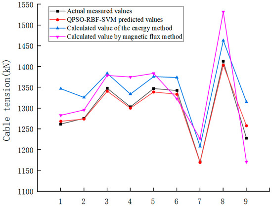 The reliability and accuracy of the QPSO-RBF-SVM model for predicting cable force were comparatively analyzed by comparing it with the formulae derived from the energy method and the magnetic flux method [26]. The basic parameters corresponding to the samples in the test set were substituted into the formula to calculate the value of cable force, and the results are presented in Figure 8.