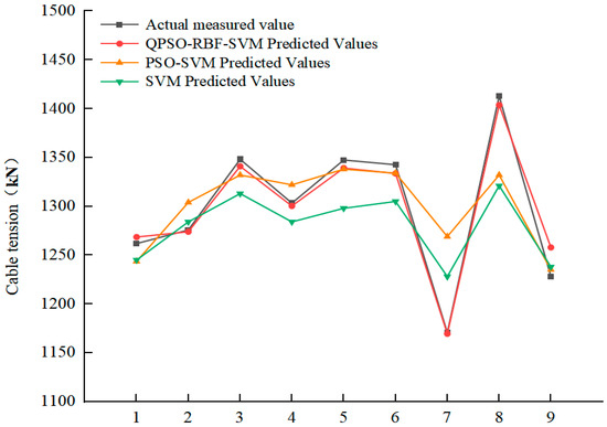 As can be seen from Figure 9, both the PSO-SVM algorithm model and the SVM algorithm model fit less well than the QPSO-RBF-SVM algorithm model, in which the SVM model has the worst fit and the average absolute error is higher than that of the other two models, whereas the error of the QPSO-RBF-SVM model is kept at a very low level and has the best fit. By comparing the results of the PSO-SVM, SVM, and QPSO-RBF-SVM algorithm models for the prediction of the cable force, it can be found that the QPSO-RBF-SVM model is able to make full use of the nonlinear characteristics of the data and find the best model parameters through the optimization algorithm, which makes the QPSO-RBF-SVM model able to fit the actual data more accurately when predicting the cable force and, at the same time, maintaining a lower error level, which provides higher accuracy and stability in the prediction of the cable force.