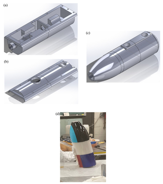 (a) SolidWorks sketch of the insert base, (b) SolidWorks sketch of the insert cap, (c) SolidWorks sketch of the nacelle, (d) and nacelle coated with epoxy. Parts (a,b) represent separate components of the insert. These components slide into the nacelle. The nacelle itself is a distinct entity from the insert components.