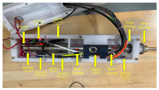 The hydrokinetic turbine model features an electric motor which can be run as a generator, and various sensors. They are all housed inside the insert. Specifically, a PMDC motor of the type DCX 35 L (Maxon Precision Motors, Inc., Taunton, MA, USA), with a power rating of 80 to 120 Watts, was used as the motor/generator. To control its operation, the PMDC motor was associated with a driver, which allowed exact control of the motor’s speed. To adjust the motor speed, a variable DC voltage source was connected to the driver. By varying the input voltage to the motor, its rotational speed could be adjusted as desired for testing purposes. The PMDC motor utilized in the hydrokinetic turbine model has a speed rating of 8130 RPM (Revolutions per Minute). However, to suit the scaled-down size of the turbine model, a planetary gear-head of the sort GPX 37 (Maxon Precision Motors, Inc., Taunton, MA, USA), with a reduction ratio of 16:1 was utilized to reduce the speed output of the motor. The decision to employ a gear-head with a reduction ratio was necessary and essential due to the fact that the hydrokinetic turbine model is restricted to a more limited rotational speed.