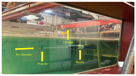 Figure 4 provides a visual representation of the prototype turbine submerged in the towing tank, illustrating the experimental setup. The towing tank environment is carefully controlled to minimize external influences that could affect the results. This controlled environment ensures that the observed performance characteristics are solely attributable to the turbine design and the towing conditions.