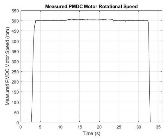 However, one might observe that a restriction exists in the testing facility which primarily comes from the length limitation of the towing tank. This may result in the turbine not having sufficient time to reach the chosen steady-state speed condition during the towing process, mainly due to this restriction. We apply a specific approach in order to overcome this towing tank restriction and ensure that our scaled model operates at the determinated speed during the towing tests. The PMDC motor serving as the prime actuator is initially powered to reach the steady-state speed before the carriage initiates towing of the turbine model. After reaching the steady-state speed, the carriage initiates towing the turbine model at the designated speed. The power consumption of the PMDC motor fluctuates in response to the dynamic force exerted by towing the turbine through the fluid throughout the towing process. The variation in power consumption observed by the PMDC motor from its initial steady-state operation to the towing stage characterizes the distinct energy exerted by inflow [62]. The dynamic energy is captured by the hydrokinetic turbine propeller and transformed into rotational kinetic energy [63]. Figure 5 presents the rotational speed of the PMDC motor, measured consistently at 500 rpm, while the system is towed at a speed of 6 feet per second. The plotted data, shown over time, reveal remarkably stable performance of the motor throughout the towing operation. The black line in the graph, which represents the rotational speed, remains mostly flat, indicating minimal fluctuation around the 500 rpm mark.