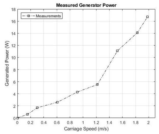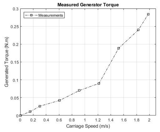 Figure 9 illustrates a graph depicting the measured generated torque as a function of carriage speed during the experimental testing. The graph demonstrates direct proportionality between the generated torque and the output power of the turbine. This means that as the power output of the turbine increases, the torque produced by the turbine also increases.