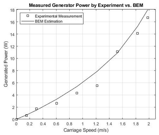 A detailed analysis of the plot reveals that for carriage speeds up to 1.2 m/s, the generated power from the BEM simulations is slightly higher than the experimental results. The experimental data show a mean power output of 5.8 W at 1.2 m/s. In contrast, the BEM simulations show a mean power output of 7.9 W for the same speed, indicating systematic overestimation by the simulations.