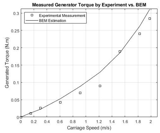 Figure 8 illustrates how the average generated power changes as the carriage speed increases from 0 to 2 m/s when comparing both the experimental and Blade Element Momentum (BEM) simulation results. The generated power serves as an indicator of the system’s power output, where an underwater current turbine converts fluid flow kinetic energy into electrical energy.