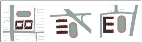 Primary school buildings in China display specific layouts and architectural designs. The design of primary school buildings follows the national standard “Code for Design of Primary and Secondary Schools” (GB50099-2011) [27], leading to similarities in building orientation, height, number of stories, and classroom size within the same climatic zone [28,29]. In cold regions, primary school buildings typically orient towards the south, are limited to four floors, and can hold a maximum of 45 children per classroom. These guidelines enhance consistency in the layout and design of primary school buildings. Presently, numerous studies categorize the arrangement of campus buildings in China as enclosed (the left one in Figure 1), row-by-row (the middle one in Figure 1), and branching (the right one in Figure 1) [30,31,32]. This trait is most noticeable in elementary school campuses. The red circle in Figure 1 indicates the educational part of the campus buildings. Regardless of the plan adopted, the prototype of the teaching buildings remains consistent.