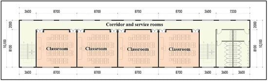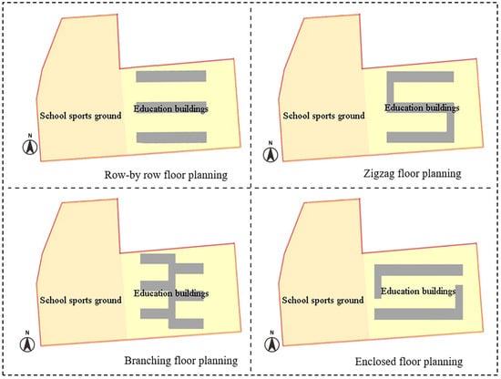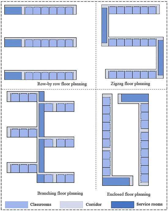 When it comes to the internal layout of buildings, the teaching buildings in primary schools generally adopt an exterior corridor design (Figure 2), with the corridor located on the north side and the classrooms on the south side [33]. This architectural floor design is currently being used as a pattern by numerous researchers in China for their research [34,35,36]. This is mainly because the “Code for Design of Primary and Secondary Schools” (GB50099-2011) requires that classrooms must be able to receive direct sunlight [27]. Consequently, examining the architectural floor plans and campus layouts of primary school buildings will yield more broadly applicable research findings for the design of primary school buildings.