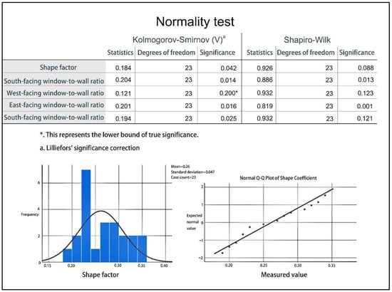 The table clearly shows that the five sets of data collected from the surveyed buildings display distinct patterns. The shape coefficient follows the order Md > M > Mo. The south-facing window-to-wall ratio follows M > Md = Mo. The west-facing window-to-wall ratio follows Mo > M > Md. The north-facing window-to-wall ratio follows M > Md > Mo. The east-facing window-to-wall ratio follows Mo > Md > M. Based on the aforementioned calculation methods, it can be observed that the south-facing window-to-wall ratio data set exhibits a skewed distribution, indicating that the median or mode should be selected as the typical value for this group. Similarly, the north-facing and east-facing window-to-wall ratio data sets also exhibit skewed distributions, suggesting the median or mode as the appropriate typical values. However, due to the significant difference between the median and mode values in these two data sets, it is necessary to plot the corresponding distribution curves, conduct a normality analysis, and then determine the final typical values. For the shape coefficient and west-facing window-to-wall ratio data sets, normal and skewed tests should be performed before deciding on their typical data values. Figure 3 illustrates a histogram of normal distribution analysis, using the shape coefficient as an example. It can be observed that the shape coefficient exhibits the highest statistical frequency within the range of 0.20 to 0.30. Furthermore, the curve is essentially symmetric, indicating a normal distribution. Through these steps, the relevant parameters of the plan form of the typical model can be extracted (Table 2). This model is used for case studies in Section 2.2.