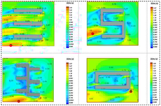 The main assessment criteria for the outdoor wind conditions in winter are the wind speed at the location and the surface wind pressure difference on the exterior walls of buildings. Figure 6 illustrates the horizontal wind speed at a height of 1.5 m outdoors for four different scenarios during winter. A red dot indicates the peak outdoor wind speed, while the black figures denote the wind speed at a height of 1.5 m. The Figure shows that the highest outdoor wind speed in the four scenarios varies from 1.5 m/s to 1.57 m/s, all falling below the 5 m/s limit set in the “Green Building Evaluation Standard” (GB/T50378-2019) [37]. The main reason for this is the obstruction and slowing down caused by the crowded buildings in the city center. Row-by-row floor planning and modest building spacing in Scenario 1 generate a “canyon effect” between buildings, resulting in higher wind speeds. The wind speed, while comfortable, helps to remove unclean air from the area and improve the rate of outdoor air renewal. Scenarios 2, 3, and 4 have buildings that hinder outside wind flow, leading to decreased wind speed. The wind speed is comfortable overall but not suitable for outdoor air circulation.