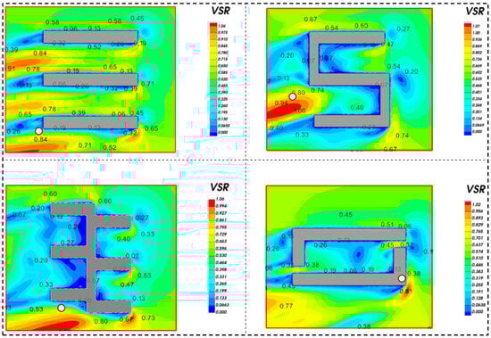 Figure 7 depicts the contour map of wind speed amplification factor distribution at a height of 1.5 m outdoors for four scenarios in winter. The maximum outdoor wind speed amplification factor is marked with a white dot. It can be observed that, in winter, the outdoor maximum wind speed amplification factors of the four scenarios are similar, ranging from 1.02 to 1.07, and all meet the requirement of the “Green Building Evaluation Standard” (GB/T50378-2019) [37], which stipulates that the wind speed amplification factor should be less than 2. Among the four scenarios, as Scenarios 2, 3, and 4 form enclosed or semi-enclosed areas, the wind speed amplification factor in the regions close to the buildings in these three scenarios is relatively small at approximately 0.2. This is consistent with the wind speed performance. The wind speed amplification factor in other regions close to the buildings does not show significant differences, with most values ranging from 0.4 to 0.5. Therefore, from the perspective of outdoor wind speed and wind speed amplification factor performance, Scenario 1, which employs row-by-row floor planning, can achieve better outdoor wind environment performance in winter.