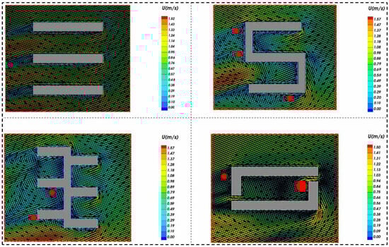 The Evaluation Standard for Green Building in China (GB/T50378-2019) [37] specifies that the evaluation criteria for the outdoor wind environment in summer involve the size of the vortex area and the windless zone, along with the wind pressure difference between the interior and exterior surfaces of the building’s external windows. Figure 9 shows wind speed vector diagrams at a height of 1.5 m above the ground for four scenarios, with vortex locations indicated by red dots. Scenario 1 is the only one that does not display vortex areas, while the other three do. Scenario 1’s row-by-row floor planning does not create a solid blocking surface, which enables the wind to move freely over the entire site, preventing the development of vortex zones. However, other scenarios create enclosed and semi-enclosed regions that obstruct airflow. In Scenario 4, the enclosed courtyard creates a restricted space, leading to stagnant airflow within the courtyard and the formation of a larger vortex area. In Scenarios 2 and 3, the vortex zones are mostly focused on the leeward side, known as the low-pressure vortex region.