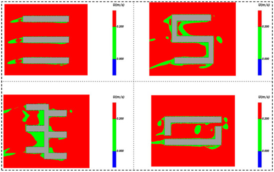 Under winter conditions, to prevent excessive wind pressure differences on building surfaces from causing cold air infiltration and indoor heat loss, the “Green Building Evaluation Standard” (GB/T50378-2019) [37] stipulates that the wind pressure difference between the windward and leeward surfaces of a building should not exceed 5 Pa. By extracting the average wind pressure values on the exterior surfaces of the teaching buildings in the four scenarios, the average wind pressure differences between the windward and leeward surfaces are calculated and presented in Table 6 below. Scenario 2 exhibits the highest wind pressure difference of 1.71 Pa, whereas Scenario 3 shows the lowest wind pressure difference of 0.74 Pa. The wind pressure differences between Scenarios 1 and 3 are 0.84 Pa and 0.74 Pa, respectively. The wind pressure differences in all four scenarios meet the standards of the “Green Building Evaluation Standard” (GB/T50378-2019) [37].
