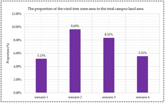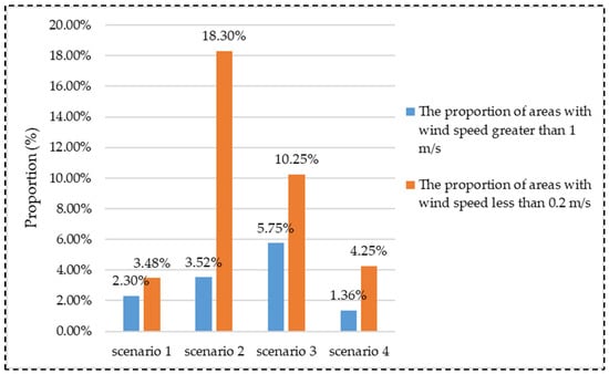 Figure 10 illustrates a distribution cloud map displaying outdoor windless zones, with green spots indicating locations with no wind. Windless zones are mainly found on the leeward side of buildings and in semi-enclosed or enclosed areas. Scenario 1, shown in Figure 11, has a windless zone size that is notably smaller, making up 5.13% of the total campus area. Scenario 4 features a windless zone area that is significantly larger than Scenario 1’s, reaching 5.52%. Scenarios 2 and 3 feature greater areas with no wind, making up 9.60% and 8.32%, respectively. Scenario 1 is the most desirable based on the proportion of windless zone area.