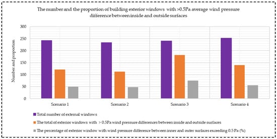 Figure 12 displays the average wind pressure difference between the inner and outer surfaces of the building’s external windows. The Evaluation Standard for Green Building in China (GB/T50378-2019) requires that over 50% of a building’s external windows must exhibit a wind pressure differential of over 0.5 Pa between the inner and outer surfaces in summer. Scenario 2’s compliance ratio for external windows is 48.29%, falling short of the threshold. Nevertheless, the other three scenarios were all above the 50% criterion. Scenario 3 excels with a compliance ratio of 75.83% for its exterior windows. Scenario 1 has a compliance ratio of 50%, whereas Scenario 4 has a compliance level of 55.56%. Thus, adopting Scenario 3 for the project could result in improved indoor air quality in the summer.