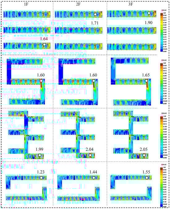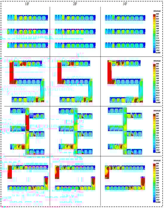 Figure 15 displays the age distribution of air on each floor for the four scenarios. Typically, there is a direct relationship between air age and indoor airflow velocity, indicating that slower indoor airflow results in a higher air age, while faster flow leads to a lower air age. The indoor air quality conditions depicted in Figure 15 closely align with those in Figure 13. Scenarios 2 and 3 have a higher proportion of regions with slower internal airflow velocity, resulting in relatively higher air ages. The region with an air residence time ranging from 200 to 300 s is notably larger compared to Scenario 1. Although there is no significant difference in the proportion of stagnant areas between Scenario 4 and Scenario 1 (4.25% vs. 3.48%), the proportion of areas with an air age between 200–300 s in Scenario 4 is significantly higher than in Scenario 1. Therefore, Scenario 1 performs the best when evaluated from the perspective of air age.