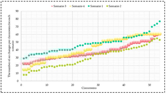 Figure 16 illustrates the air exchange rates in classrooms for the four scenarios. Scenarios 1 and 4, which showed superior indoor wind speed and air age performance, also exhibit higher indoor air exchange rates. Scenarios 2 and 3 have lower air exchange rates compared to Scenarios 1 and 4.