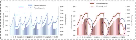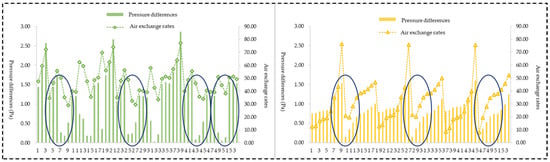 However, the positive correlation between the wind pressure difference and the air exchange rate is not as strong in Scenarios 2 and 4 as it is in Scenario 1. In some local variations, there is a certain degree of non-correlation. For example, in Scenario 2 (as indicated by the circled area in Figure 17), the air exchange rate of classrooms 13–19 actually decreases when the wind pressure difference at the exterior windows increases. In Scenarios 3 and 4, the changes in wind pressure difference and air exchange rate are generally consistent. However, there are instances where the air exchange rate increases significantly even when the wind pressure difference increases marginally, indicating non-correlation (as indicated by the circled area in Figure 18).