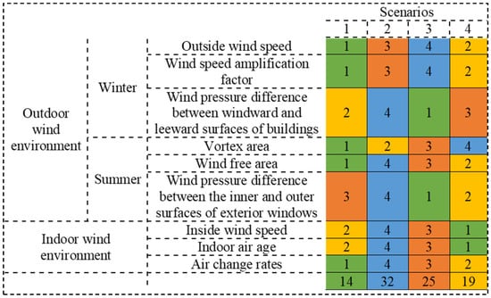 Based on the simulation results in Section 3, the four scenarios were ranked on a scale of 1 to 4 for their performance in terms of winter, summer, and indoor wind environment evaluation indicators. A lower score signifies superior performance in external wind conditions and indoor ventilation effectiveness. Figure 19 presents the sorting results using distinct colors to facilitate readers’ comprehension. Scenario 1 outperformed the others, achieving a total score of 14. This is mainly because of the implementation of row-by-row floor planning, which enables wind to flow across the entire site, leading to outstanding performance in metrics such as outside wind speed, wind speed amplification factor, vortex areas, and windless regions. Therefore, interior wind environment indicators that have a positive correlation with these factors, such as air exchange rate and indoor wind speed, also showed good performance.