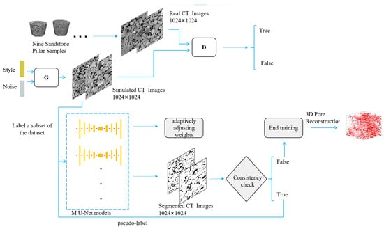 The traditional methods of image segmentation technology are mainly based on two key characteristics: similarity and boundary discontinuity. Similarity means that the pixels in the same region of the image have similar gray values, which is the basis of the region segmentation method. Boundary discontinuity indicates that there are obvious gray changes between different regions, which is the key to the edge detection method. The OSTU algorithm is an efficient region segmentation algorithm [20] and has been applied to the analysis of rock porosity [21]. Through research, researchers have found that the rock physical properties calculated using the threshold–porosity relationship are more accurate than the classical segmentation methods [22,23]. With the rapid development of deep learning technology [24,25], image segmentation methods based on deep learning are constantly emerging [26,27,28] and are increasingly widely used in the field of digital cores. For example, Manzoor et al. proposed using the SegNet network to automatically segment digital rock images, effectively improving the accuracy of image processing [29]. Alqahtani et al. further explored the application of convolutional neural networks in the super-resolution segmentation of carbonate rock images [30], providing a new perspective for high-precision geological analysis. The U-Net architecture, due to its excellent image segmentation performance, has been widely used in the field of the automatic segmentation of rock images, especially in the image analysis of rock types such as sandstone [31]. In recent years, researchers have made various innovative improvements to U-Net. For example, in the research by Chen et al. in 2024, Pore-net [32] was proposed, which is an improved model based on U-Net. This model significantly improves the efficiency of pore identification by optimizing the data-reading strategy, increasing the number of convolutional layers, and integrating the Canny edge detection algorithm. In addition, Liu et al. proposed a deep learning method called UR network that combines U-Net and Res_Unet to address the segmentation accuracy problem caused by the adhesion of ore particles and dark areas [33]. This method first uses U-Net to conduct a preliminary ore contour detection and then further refines the contour through Res_Unet to improve the segmentation accuracy. In the research published by Li et al. in May 2024 [34], a new semantic segmentation network that combines U-Net and Transformer, namely Diamond-Unet, was proposed. This innovative model introduces the Feature Cross Fusion Path (FCFP) to enhance the network’s ability to capture fine-grained details and understand coarse-grained semantics in full-scale image segmentation. Although the above methods have achieved remarkable results in the fully supervised learning framework, as the requirements for image segmentation accuracy continue to increase, the traditional fully supervised methods gradually show limitations due to their dependence on a large amount of professionally annotated data. To address this challenge, semi-supervised learning methods have rapidly become the research hotspot due to their potential to reduce annotation requirements while maintaining high segmentation accuracy and have made breakthroughs in multiple fields [35,36,37]. Currently, semi-supervised technologies such as pseudo-label technology [38], consistency regularization [39], and graph learning methods [40] are particularly concerned. Yin et al. proposed a semi-supervised learning model SU-Net [41] based on U-Net in 2023 which combines unsupervised and semi-supervised learning strategies and effectively reduces the dependence on a large amount of labeled data. Liang et al. further proposed an improved semi-supervised support vector machine-fuzzy C-means (CSVM-FCM) algorithm [42] which realizes a more refined segmentation of pores and rocks in the image through the optimization of the objective function. In view of the limitations of the pseudo-label technology [43], we have proposed an innovative Adaptive Bagging method, improved the multi-model weight adjustment strategy, and optimized the pseudo-label generation process. We use multiple U-Net models to evaluate the accuracy of the pseudo-labels based on porosity consistency and, with the support of high-quality images generated by StyleGAN2-ADA, not only improve the robustness of the model but also enhance the generalization ability of the model, bringing new perspectives and solutions to the field of digital core image segmentation. Code is available at https://github.com/sumqiu/ELSSL and was accessed on 13 August 2024.