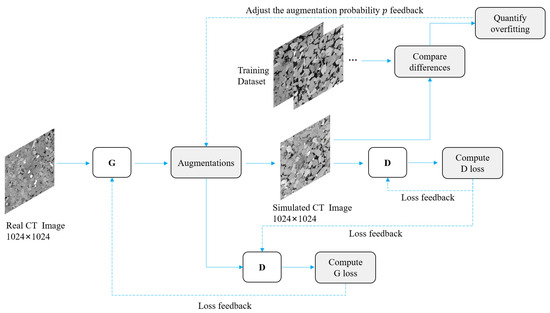 In the realm of image generation, GANs have demonstrated exceptional data-generation capabilities across various fields [13,14]. For instance, in 2020, Kramberger and Potočnik improved the quality of a large-scale automotive image dataset using StyleGAN [15]. This advancement has paved new avenues for image data augmentation and quality improvement. StyleGAN2-ADA, an advanced version of StyleGAN, uses adaptive discriminator augmentation to generate high-resolution, visually realistic images. In 2023, Wang et al. applied StyleGAN2-ADA to an algae classification model, significantly improving classification accuracy by 16% through image augmentation [16]. That same year, Ahn et al. generated high-resolution knee X-ray images using StyleGAN2-ADA, which closely resembled real images both visually and statistically, exhibiting characteristics akin to a real dataset [17]. In 2022, Liu and Mukerji ingeniously applied StyleGAN2-ADA to generate high-resolution 2D scanning electron microscope images, providing a new solution for the three-dimensional reconstruction of digital cores [18]. In 2023, Bhosale et al. explored using StyleGAN for data augmentation to enhance the segmentation accuracy of medical CT images [19]. This study employs StyleGAN2-ADA technology to augment 2D CT grayscale images, aiming to improve image segmentation accuracy by enhancing image quality.