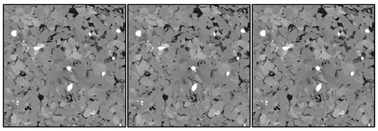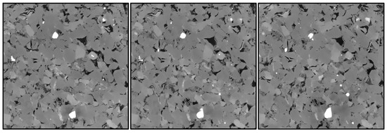 This study drilled 9 small cylindrical samples, each with a diameter of 4 mm, from a cylindrical sandstone sample with a diameter of 2.5 cm. Using CT scanning technology, high-precision imaging was performed on the samples. Subsequently, the CT scan results were meticulously processed using the Avizo software. The imaging data of the first small cylinder contained 840 continuous two-dimensional CT grayscale images of 800 × 845 pixels (see Figure 3). To avoid the pattern collapse phenomenon that may occur in deep learning training, where the generative model begins to generate almost identical images (see Figure 4), this study adopted an innovative interval selection strategy. This strategy ensures the diversity and quality of training data by assessing the degree of change between continuous-layer two-dimensional CT grayscale images. We established a method of selecting one image as training data from every 30 two-dimensional CT grayscale images by calculating the similarity between consecutive layer images. This method ensures that the selected images have significant visual differences, thus avoiding excessive similarity between the images. Ultimately, the first small cylinder selected 28 two-dimensional CT grayscale images as training data. The processing of the other samples followed the same method, accumulating a total of 295 non-continuous high-resolution two-dimensional CT grayscale images of 1024 × 1024 pixels, providing a high-quality dataset for the subsequent deep learning training.