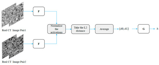 LPIPS is an advanced image quality assessment tool that uses deep learning models to measure the perceptual differences between images. Compared to traditional pixel-level comparison methods such as SSIM, LPIPS is more reflective of human visual perception characteristics. In the LPIPS assessment process (see Figure 5), the input of two images is first passed through a pre-trained convolutional neural network (such as VGG19) to extract feature embeddings, which capture high-level semantic information of the images. Subsequently, the feature embeddings are normalized on each channel, scaled to the range of [−1, 1] or [0, 1], and then weighted by a weight vector. Next, the L2 distance of the weighted feature embeddings is calculated to quantify the differences in the feature space of the images. The L2 distances of all the layers are averaged to obtain a global distance measurement, corresponding to the d0 and d1 of the image pair, respectively. Finally, these two sets of global distance measurements are used as inputs to provide a small network G, which is trained to predict human perceptual judgments of the image pairs, outputting h.
