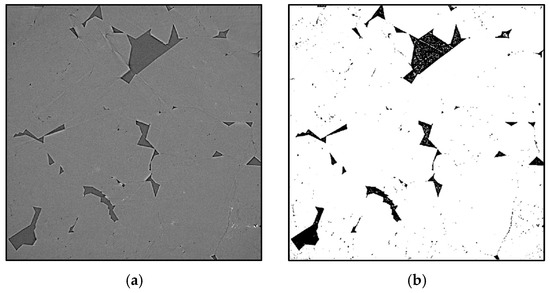 (a) Original 2D CT grayscale image of Fontainebleau sandstone; (b) pore segmentation of the same region using the OTSU algorithm.