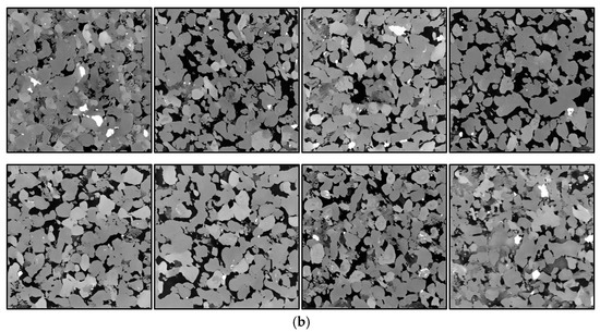 In previous quantitative analyses, it was determined that increasing the total number of training images to 2,000,000 and adjusting the batch size to 16 significantly enhanced the performance of the generative model. To further evaluate the model’s generative capabilities, we conducted a visual analysis of the generated images, as shown in Figure 7a,b. Through detailed comparisons, it is evident that the generated images exhibit a high degree of visual similarity to real images. Specifically, the generated images accurately simulate the complex details found in real images, including the uneven distribution of large and small pores, fine cracks between particles, and the intricate mixture of clay and pores. The accurate reproduction of these details not only confirms the model’s high precision in simulating real images but also demonstrates the effective guarantee of diversity in the generated images. Combining the quantitative and qualitative evaluation results, we can conclude that this generative model excels in simulating real images and achieves outstanding visual quality.