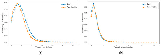 As shown in Figure 10a, the distribution of throat lengths in both the real and synthetic 3D pores exhibits a certain degree of consistency, despite some subtle differences. Prior to the intersection point, the synthetic 3D pores show a higher probability distribution in the shorter throat length region, indicating that the segmentation model is more sensitive to, or more inclined towards, identifying shorter throat structures. However, beyond the intersection point, the probability distribution of the real 3D pores surpasses that of the synthetic ones, suggesting that the segmentation model’s accuracy in recognizing longer throats requires improvement. This variation implies that the model may need further optimization to more accurately reflect the throat length characteristics of real sandstone. Despite these differences, the overall distribution trends in both datasets are similar, indicating that the synthetic 3D pores can fairly approximate the throat length distribution of real sandstone to a certain extent. This similarity reflects the segmentation model’s high accuracy in simulating the pore structure of sandstone. Nevertheless, to more precisely emulate the characteristics of real sandstone, especially in recognizing longer throats, the segmentation model may need further fine-tuning to balance the identification of the throats of varying lengths.