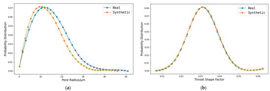 The pore radius distributions of the real and synthetic 3D pores are shown in Figure 11a. The pore radius distribution of real 3D pores starts at smaller radii, reaching a peak probability distribution as the radius increases, and then gradually declines. The highest probability distribution for real 3D pores occurs at a pore radius of 9.342494 μm, indicating that pores within this radius range are more common. In contrast, the synthetic 3D pores generated by the segmentation model reach their peak probability distribution at a slightly higher radius of 10.353425 μm. This suggests that the segmentation model might be more sensitive or biased towards identifying medium-radius pores. As the pore radius further increases, the probability distribution of synthetic 3D pores declines more rapidly, particularly in the identification of larger radius pores, where the probability distribution is lower than that of real 3D pores. This implies that the segmentation model’s accuracy diminishes in simulating large-radius pore structures. Overall, while the segmentation model exhibits trends similar to real 3D pores in certain aspects of the pore radius distribution, the rapid decline in probability distribution for larger radius pores indicates that further optimization and adjustment may be necessary to improve simulation in this area.