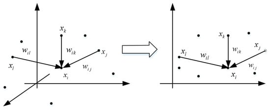 For sample wi that is not in the neighborhood of sample wj, let the corresponding αij = 0. The weight coefficients of the linear relationship between wi and its neighbors can be determined by Formulas (12) and (13). Then, the above optimization problems are solved by the Lagrangian multiplier method, and Formula (12) is obtained by matrixization.