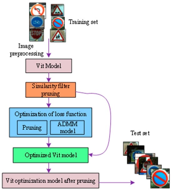 This paper employs the Alternating Direction Method of Multipliers (ADMM) to address the model pruning problem and accelerate model training. The primary feature of the Local Linear Embedding (LLE) method in manifold learning is to convert high-dimensional data into low-dimensional data without destroying the manifold structure. By using this feature of the LLE method as the loss function during model training and taking the weight parameters of the pre-trained model as the input of the loss function, the initial model is trained to obtain the pre-trained model. After multiple iterations of training, the similarity filter pruning method proposed in this paper is applied to prune the filters of the trained model. This reduces the number of model parameters, allowing the traffic sign recognition model to operate without relying on additional storage devices in practical applications, making it widely applicable on resource-limited platforms. The pruning operation of the Vision Transformer (ViT) model for traffic sign recognition proposed in this paper is shown in Figure 1, and the process of pruning the model with the proposed method is as follows:
