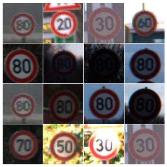 There are 43 categories of traffic signs in the GTSRB dataset, where the training set contains 34,799 images, the validation set contains 4410 images, and the test contains 12,630 images. The image size is 32 × 32, with three color channels. The number of images in each category of the test set varies greatly, so the number of samples in each category is equalized to 50,690, and some images of the GTSRB dataset are shown in Figure 7.