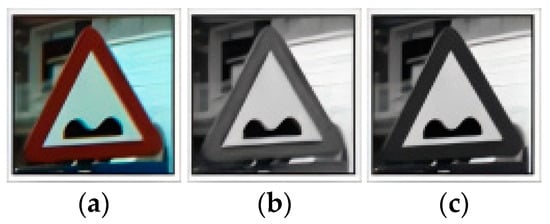 As shown in Figure 8, Figure 8a shows the original image of the traffic sign, Figure 8b shows the image of the V channel in HSV through histogram equalization, and Figure 8c shows the image of the Y channel in YUV through histogram equalization. It can be seen from Figure 8b,c that after histogram equalization of the image, the image data is converted into a range of [−1, 1], and the poorly lit image has a better graphic outline. Through this preprocessing method, the contrast of parts of the image is enhanced without affecting the overall contrast.