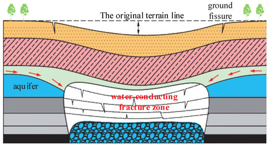 With the continuous mining of coal resources in the overlapping area, the surface overlying strata corresponding to the working face gradually migrate and deform, forming a dynamic moving subsidence basin on the surface. When a pipeline is located at the end of the suspended rock layer above the goaf of the coal mining face, the pipeline will be partially suspended under the tensile stress caused by the bending of the overlying rock layer. At this time, the pipeline is in a stress state at the top, and its bottom is suspended, which can easily lead to problems such as pipeline deformation and fracture failure. Especially in the case of high-intensity mining in the overlapping area, the development of a water-conducting fracture zone to the high-level aquifer leads to a decline in the aquifer water level, and the range and depth of surface subsidence will increase significantly, as shown in Figure 1.