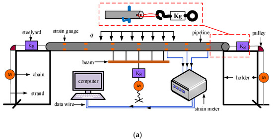 The two ends of the test frame were arranged with electric scales; the pipeline end was connected with the electric crane through the steel strand, and the electric scale was connected with the pulley and the guide chain through the steel strand. After applying a uniform load to the middle of the pipeline, the force at both ends could be displayed in real time by the electric scale. Researchers record the bearing load in the middle of the pipeline and the tension value at both ends after each load is applied. When the pipeline is fixed at both ends and a uniformly distributed load is applied in the middle, a certain bending deformation will occur. The two ends of the pipeline are connected by thin lines. After applying the expected load, the distance between each position of the pipeline and the thin line was measured to evaluate the settlement of the pipeline.