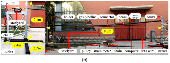 Referring to the geological conditions of 22106 working face of a mine in the gas–coal overlap area, a test bench for the ‘deformation evolution characteristics of natural gas pipelines under load‘ was designed. Considering the boundary effect, a guide chain was installed to control the displacement change of the end of the pipeline. By applying a uniform load to the middle area of the pipeline, the stress state of the pipeline was analyzed when the pipeline was loaded at the top while the bottom was suspended. The test bench was composed of a holder, a guide chain, an electronic hanging scale, a natural gas pipeline, a pulley, a steel strand, a rope buckle, a beam, a fastener, a strain gauge, a computer, and so on. The material of the test bench holder was 32a channel steel with a thickness of 6 mm, and the section size was 120 mm × 60 mm. In the middle of the holder, a cross steel tube beam was used to improve the strength of the holder, and the connection of the holder was fixed by welding. The pulley was 120 mm high and 50 mm in radius. The electric scale and the guide chain were connected by the steel strand and the rope buckle. The two ends of the pipeline were drilled separately, and the steel strand passed through the borehole to connect the electric scale with the pipeline. The lead chain was 2 t at both ends and 3 t in the middle, and the electric weighing range was 3 t, as shown in Figure 2. The beam was fixed in the middle area of the test pipeline by fasteners. By continuously tightening the length of the guide chain, a uniform load was applied to the middle of the pipeline. The load could be displayed in real time on the electric scale. After the expected load was reached, the pulling of the guide chain was stopped; so, the load could be stopped.
