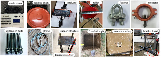 As shown in Figure 2, the main equipment used in the test included electronic hanging scales, chain guides, strain gauges, pulleys, rope buckles, expansion screws, fasteners, anchor screws, etc. The electronic hanging scale model was OCS-NF-3T, the maximum bearing capacity was 3 t, the minimum bearing capacity was 20 kg, and the safety load was 125% of the maximum value; the chain guide model was HSZ-SERIES0.5-20/TON, the maximum range was 3 t; the strain gauge model was BZ2205C, with resolution of 0.1 με and accuracy of 0.1% ± 1 με, and the test point was 16 bits. The diameter of the pulley was 100 mm, and the pulley was arranged at the end of the bracket for connecting the electronic hanging scale and the guide chain. The rope buckle model was M15 and was used to fasten the steel strand; the diameter of the fastener was 80 mm, and the bolt model was M16. The bolt passed through the fastener on the pipeline and was fixed together with the beam to apply a uniform load to the pipeline. The expansion screw model M16 × 200 was used to fix the bracket to a horizontal surface, as shown in Figure 3.