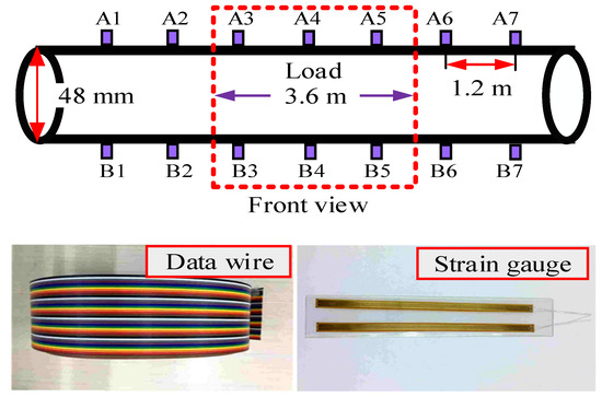 In order to analyze the deformation evolution of buried gas pipelines under the action of surface soil collapse, the reference parameters of natural gas pipelines laid in a gas field were simulated by using a 1:1 replica pipeline of 20 # steel, with an outer diameter of 48 mm, a wall thickness of 3 mm, and a length of 8.8 m. The strain gauge model used in this test was BX120-100AA (100 × 3), the resistance value was 120 ± 0.2 ohm, the sensitivity coefficient was 2.08 ± 0.1%, and the accuracy level was A. In order to record the strain evolution process of the pipeline in the process of soil collapse, we analyzed the strain distribution law and stress state characteristics of the pipeline. The strain gauges were arranged at the top and bottom of the pipeline and symmetrically on both sides every 1200 mm, with the middle of the pipeline as the center. Seven strain gauges were arranged at the top and bottom of the pipeline. In order to apply a uniform load to the pipeline, a 3.6 m area in the middle of the pipeline was connected with fasteners and beams. A downward tension was applied to the beams to achieve a uniform load in the 3.6 m area in the middle of the test pipeline, and the deformation evolution characteristics of the pipeline under uniform loading were simulated. Before the test, a ruler and an oil pen were used to mark the position of the strain gauge at the top of the pipeline. The strain gauge was pasted after the pipeline was placed horizontally and kept neat during the arrangement process, as shown in Figure 4.